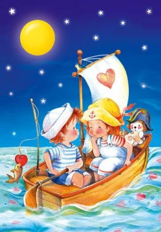 Puzzles dla dzieci Boat Friends strong> przejmując dzieci, które z odrobiną umiejętności budują romantyczny obraz nocnego rejsu statkiem. Gwiazdy świecą na niebie, a księżycowa łódź płynie spokojnie po falach oceanu, odbijając małe czerwone serca. Wielkie serce na białym sztandarze leci nad głową chłopca z wiosłem w dłoni i dziewczyną z czerwoną kotwicą na żółtej czapce. Oboje patrzą na siebie zakochani, podczas gdy mała haleczka obserwuje ich z dziobu łodzi. Mała rybka ma również kształt serca, ale chłopiec i dziewczynka wydają się widzieć tylko siebie.